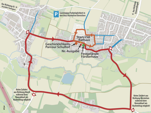 Auf Grund der zwei Strecken ist das Parken an der Kirche, im Neubaugebiet und den anderen Straßen des kleinen Rundkurses zwischen 9.00 Uhr und 13.00 Uhr nicht möglich. Beachten Sie außerdem, dass das Parken und Abfahren entlang der Hauptstraße, Hinter den Eichen (inkl. Netto-Parkplatz) und an der Eichmattenhalle ab 12.00 Uhr nicht mehr möglich ist, da der große Rundkurs ab diesem Zeitpunkt bis ca. 19.30 Uhr geschlossen wird. (siehe auch Lageplan weiter unten)